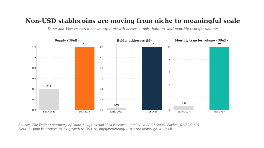 A March 2026 report synthesized by Dune Analytics and Visa, and later covered by Forbes and other outlets, found that non-USD stablecoins had reached roughly US$1.2 billion in supply, with holder addresses rising from about 40,000 to 1.2 million in three years and monthly transfer volume increasing from US$600 million to US$10 billion. Just as important, the activity appears increasingly functional rather than speculative: approximately 80% of non-USD stablecoin activity is tied to payments and treasury flows rather than DeFi. [5] [6]