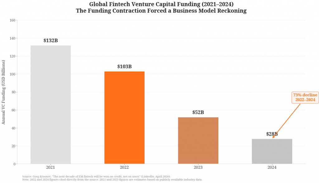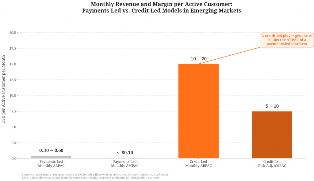 The 2022–2024 funding contraction did the work no investor memo could. Global fintech VC funding fell from $103B in 2022 to $28B in 2024 — a 73% collapse. Capital reallocated into a smaller number of larger checks, written into models that produce real net interest income rather than thin interchange. In that environment, the math became hard to ignore: payment-led platforms generate monthly ARPAC of $0.3-$0.6 and AMPAC of $0.1 or less on most lanes. At the same time, EM consumer lending yields typical ARPAC of $10-20, and if risk is managed well – $5-10 risk-adjusted AMPAC. You can scale a wallet to nine figures of users and still not earn enough per user to fund the cost of acquiring them. You cannot say the same about a loan book.