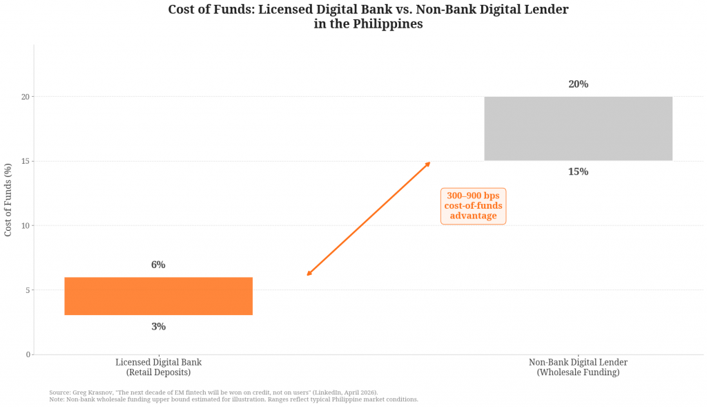 Third, the funding source determines the floor. Non-bank digital lenders fund themselves wholesale at 15%+ in the Philippines. A licensed digital bank funds itself through retail deposits at 3–6%. That is a 300–900 bps cost-of-funds advantage, compounding every quarter. It is the difference between a business that scales profitably and one that scales until the wholesale window closes.
